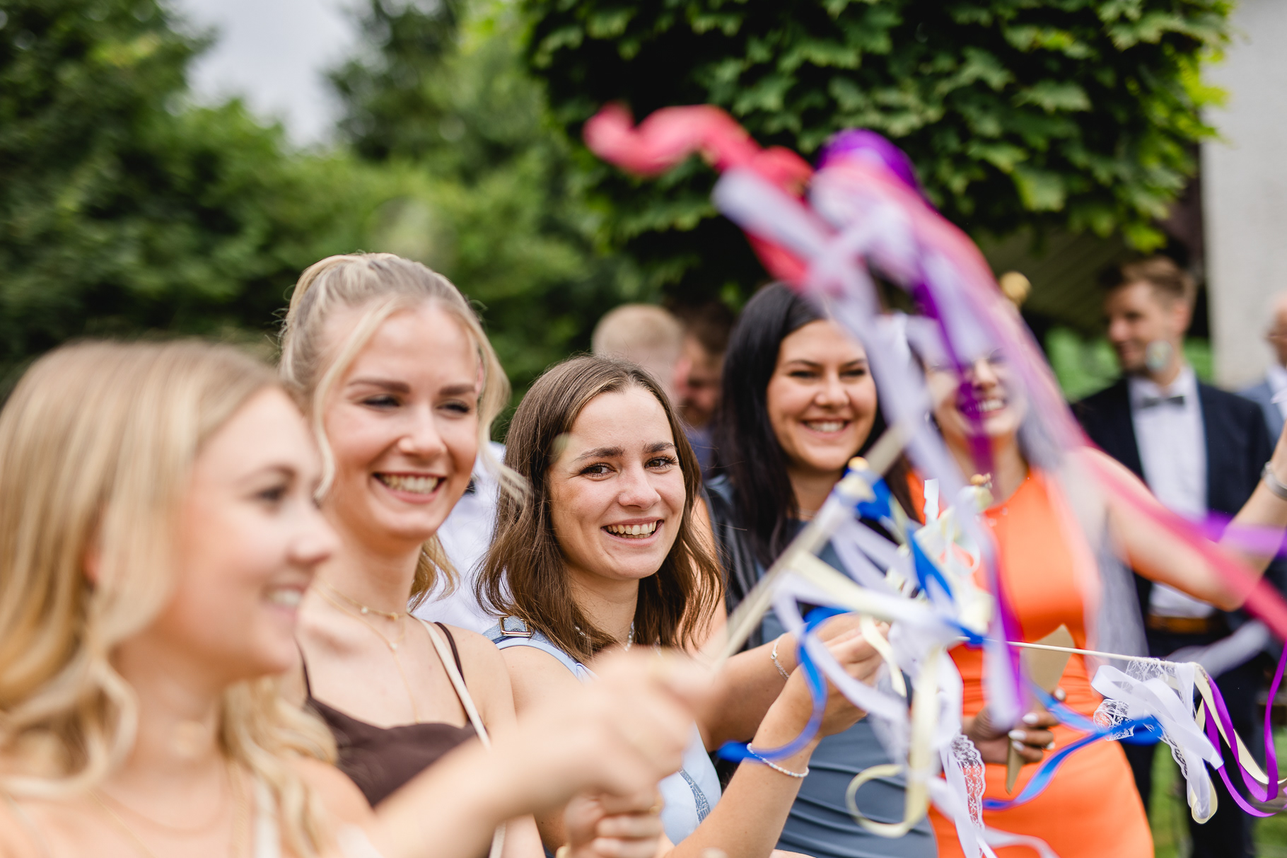 Was für ein Fest! Diese farbenfrohe Hochzeit war ein echtes Highlight meiner Saison als Hochzeitsfotografin im Sauerland. Das Brautpaar hat mitten im Grünen ein großes Zelt im eigenen Garten aufstellen lassen – geschmückt im Festival- und Nomadenstil, mit bunten Blumen, wilden Farben, vielen liebevollen Details und ganz viel Herzblut. Eine Hochzeit wie aus einem Sommertagtraum – locker und lebendig, wie ein farbenfrohes Festival. Überall hingen bunte Bänder, wilde Blumen, Girlanden und Lichterketten. Die Tische waren liebevoll gedeckt, jedes Detail war durchdacht – vom handgemalten Menü bis zu den kleinen Dekoideen mit viel Persönlichkeit. Diese Zelthochzeit war bunt, fröhlich und voller Leben – wie ein Sommertag, den man nie wieder vergisst. First Look auf Gut Wenne Bevor es zur Trauung ging, haben wir uns für ein entspanntes First Look Shooting auf dem wunderschönen Gut Wenne getroffen. Dort haben sich die beiden zum allerersten Mal an diesem Tag gesehen – ein ganz besonderer Moment, ganz für sich. Die Stunde vor der kirchlichen Trauung haben wir genutzt, um in aller Ruhe und ohne Zeitdruck natürliche Paarfotos zu machen. Der alte Gutshof mit seinen historischen Gebäuden, Kopfsteinpflaster und verwinkelten Ecken war die perfekte Kulisse. Da es am Tag zuvor geregnet hatte, konnten wir die festen, trockenen Untergründe optimal nutzen – so blieb das Brautkleid sauber und wir konnten trotzdem draußen fotografieren. Eine ganz ruhige, intime Auszeit vor dem Trubel des Festes – und ein wunderschöner Auftakt für diesen besonderen Tag. Kirchliche Trauung in der Waldkapelle Ein ganz besonderer Moment: Die beiden wurden mit einem knallgelben VW T1 Bulli überrascht – ein echter Hingucker und das perfekte Hochzeitsauto für diesen Tag. Gemeinsam ging es zur kleinen Fatima-Kapelle am Waldrand, wo sie sich im Beisein ihrer Freunde und der ganzen Familie kirchlich das Ja-Wort gaben. Das Wetter spielte mit, die Stimmung war voller Vorfreude und das Setting mitten in der Natur hätte schöner nicht sein können. Eine kleine Band begleitete die Trauung mit Live-Musik und sorgte für Gänsehautmomente. Nach der Zeremonie wurde angestoßen – mit eisgekühlten Getränken und ganz viel Freude. Danach fuhr das Brautpaar im gelben T1 zurück zum Garten, wo das große Festzelt schon wartete. Und dort wurde gefeiert, gelacht und getanzt – bis tief in die Nacht, unter Lichterketten und Sternenhimmel. Wenn ihr selbst eine ganz persönliche Hochzeit plant – ob im Garten, im Zelt oder unter freiem Himmel – dann schaut euch diese Galerie an. Vielleicht findet ihr darin nicht nur Inspiration, sondern auch die Fotografin, die euch an eurem Tag begleitet.