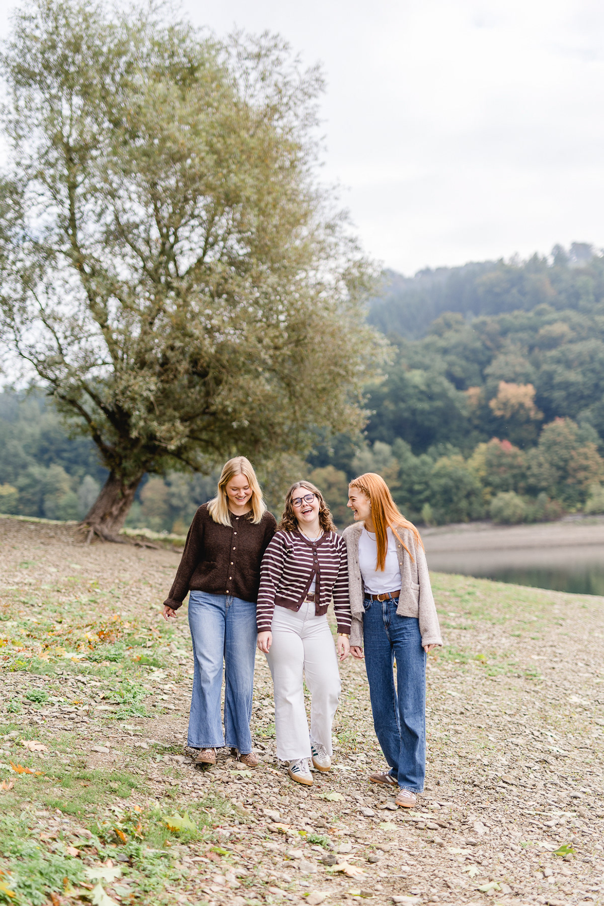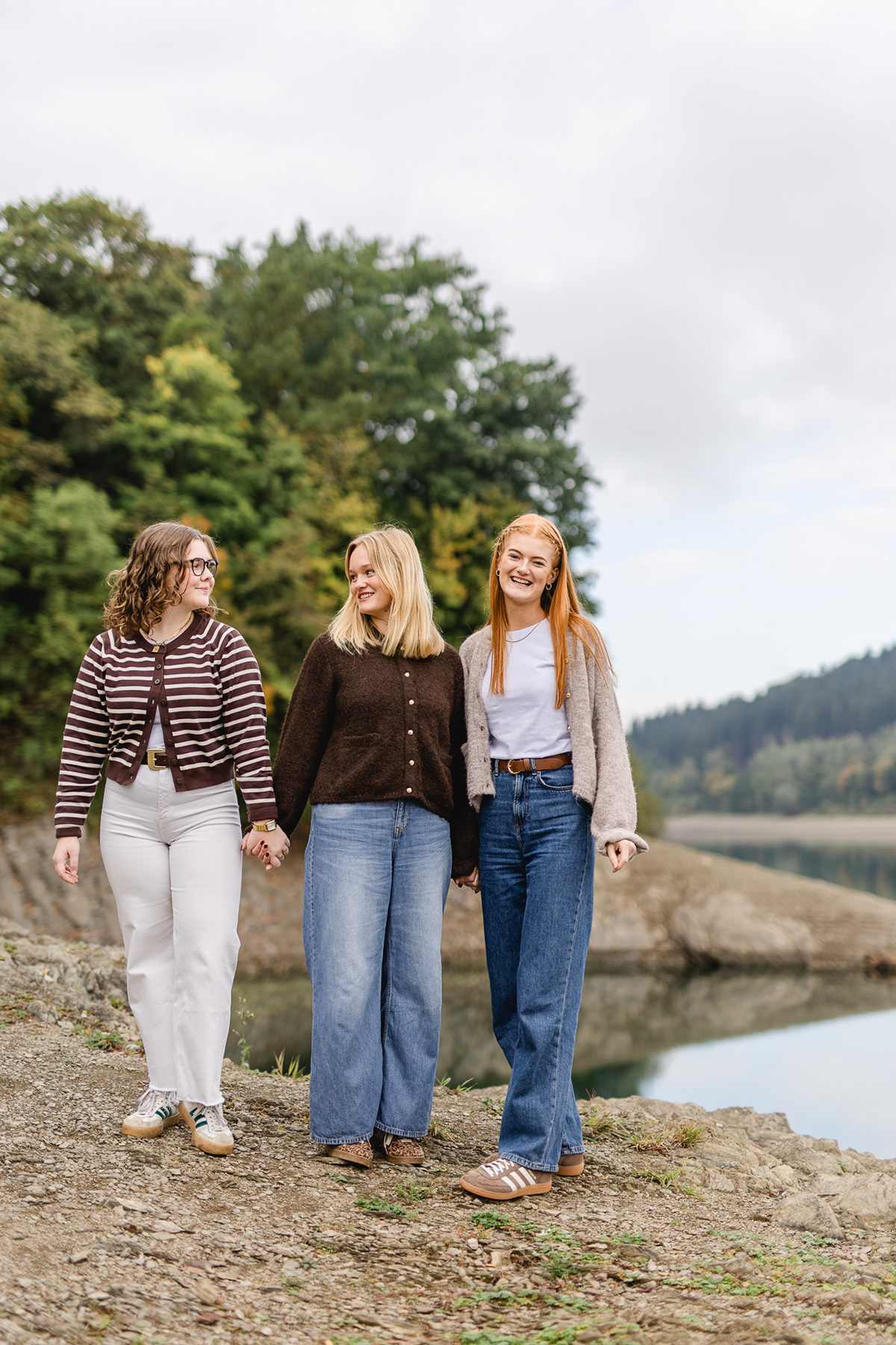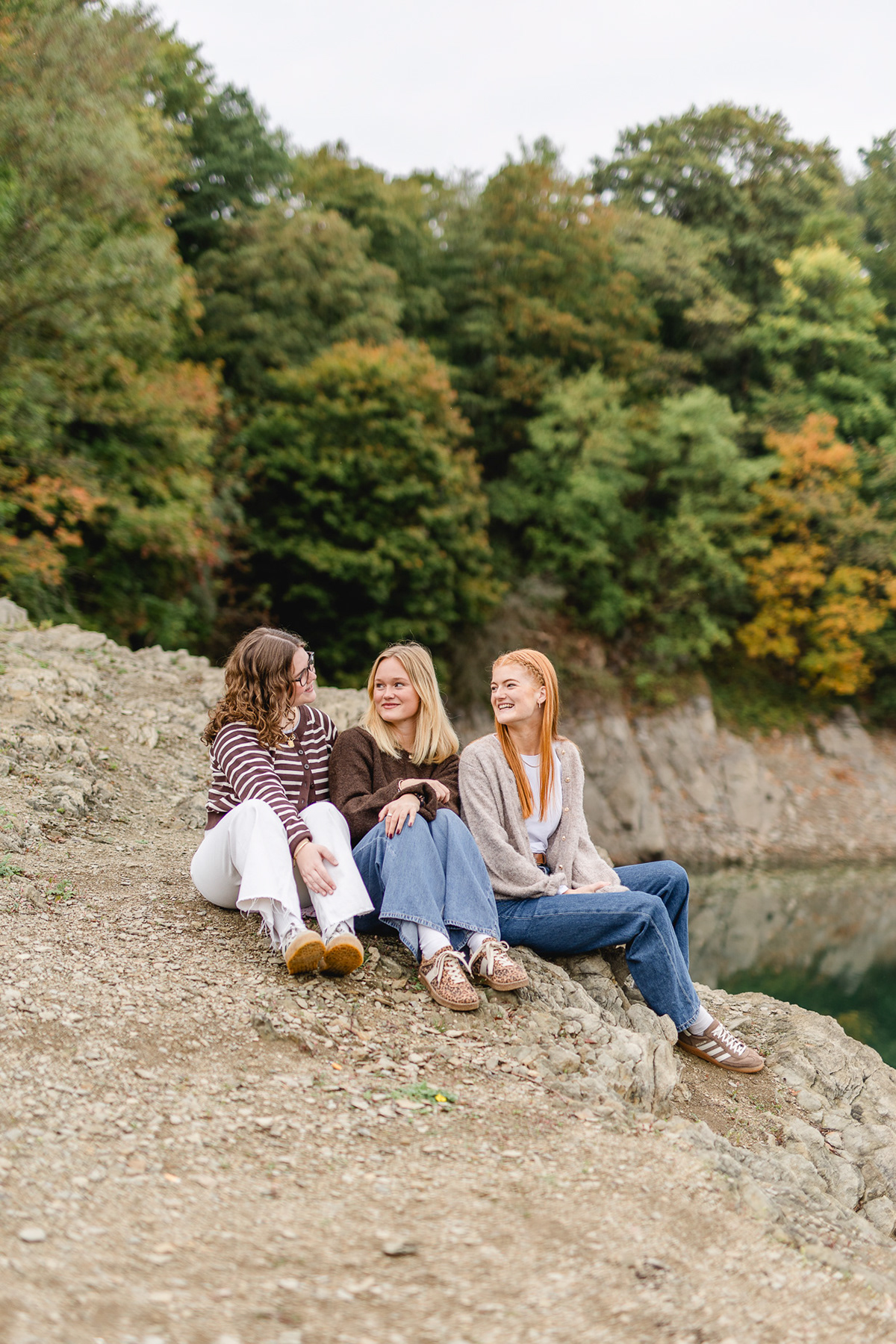 Gemeinsame Zeit, Sonne im Gesicht und ganz viel Lachen – dieses Freundinnen-Shooting am Hennesee bei Meschede war einfach schön. Ich liebe diese Location, weil sie so vielseitig ist – perfekt für natürliche Portraits, kleine Gruppen oder auch größere Freundinnenrunden. Nach dem Shooting bietet sich ein Abstecher ins H1 Café direkt am See an – für Kaffee, Kuchen und einen richtig schönen Ausklang. Die drei Mädels haben sich das Shooting geteilt – so hatte jede tolle Einzelportraits und gleichzeitig viele gemeinsame Bilder. Das ist übrigens eine super Geschenkidee: ein Gutschein für ein gemeinsames Fotoshooting mit den besten Freundinnen oder Schwestern. Ihr teilt euch einfach das Shooting, habt einen wunderbaren Nachmittag zusammen – und bekommt alle bearbeiteten Bilder eurer Serie inklusive. So entstehen Erinnerungen, die bleiben – ganz ungezwungen, fröhlich und authentisch. Ich fotografiere im ganzen Sauerland – rund um Meschede, Arnsberg, Schmallenberg, Eslohe und Sundern – natürliche Portraits und Gruppenfotos für Freundinnen, Familien und Paare.